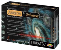 Mit der Aureon 7.1 Universe werden Top-Spiele und Filme auf DVD mit packendem, realitätsnahem Surround-Sound zum absoluten Klangerlebnis. Auch Musiker kommen auf ihre Kosten, denn an die Aureon 7.1 Universe können auch unzählige Klangquellen angeschlossen werden, um den Rechner beispielsweise in ein Harddisc-Recording-Studio zu verwandeln. Das mitgelieferte 5,25 Zoll Frontmodul bietet neben Stereo Ein- und Ausgängen für analoge und digitale Geräte (optisch und koaxial) auch Anschlüsse für Kopfhörer und Mikrofon. Auch die direkte Anbindung von Tapedeck oder Schallplattenspieler ist möglich. Der mitgelieferte Phono-Verstärker (mit Hardware RIAA Entzerrung) inklusive Profi-Software zum Restaurieren alter Aufnahmen ermöglicht das Übertragen von alten Schallplatten auf digitale Speicher. Last but not least kann der Rechner auch über das Frontmodul via Infrarot-Fernbedienung angesteuert werden. Ob DVD, Musik oder Spiele - die Aureon 7.1 Universe passt sich gängigen Standards an: Sensaura 3D, EAX, ASIO, A3D, DirectSound. Via Non-Audio-Mode werden beispielsweise AC3-Streams direkt zur optischen Digital-Schnittstelle weitergeleitet. Umfangreiche Software rundet den Lieferumfang ab.
