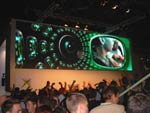 Ohnehin hätte wohl ein Großteil der Besucher sowieso nichts von Doom III und Co. gehabt, da entsprechende Bereiche auf verschiedenen Ständen abgegrenzt wurden und nur für Personen mit einem Mindestalter zugänglich waren. Bevor man also einen solchen Raum betreten durfte, musste man sich ein Armbändchen holen (waren in den Hallen erhältlich). Insgesamt gab es drei verschiedene Bänder (12, 16 oder 18 Jahre alt). Somit konnte man sich Zugang zu den abgesperrten Bereichen verschaffen. Ein Sechszehnjähriger hatte somit absolut keine Chance einen Blick auf ein Spiel zu werfen, welches erst ab einem Alter von 18 erhältlich sein wird. Passend hierzu war auch das Jugendamt Leipzig auf der Messe mit einem Stand vertreten. Im Großen und Ganzen waren wir vom Großteil der gezeigten Spiele nicht sehr angetan, jedoch waren auch einige Leckerbissen dabei, die ein Warten auf jeden Fall wert sind. Als kleines Highlight konnte man auch das Computerspiele-Museum bezeichnen, in welchem man das erste in Deutschland indizierte PC-Game (Flugsimulator in Overkill-Manier), das erste kommerzielle Spiel und vieles mehr bestaunen und auch selbst zocken konnte. Abschließend hier auch noch ein paar Bilder des Xbox Standes mit seiner gigantischen Laser-Wand (etwa 40 m²)...