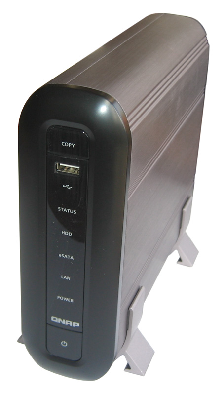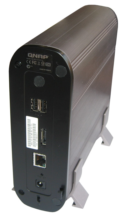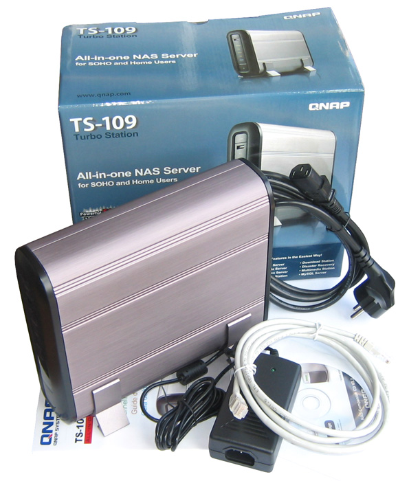 Rein äußerlich kommt der TS-109 (210 x 60 x 182 mm; Tiefe x Breite x Höhe) im Stile einer einfachen externen Festplatte daher, bietet jedoch deutlich mehr als einen einfachen Datenspeicher. Im Inneren befindet sich ein 500 MHz schneller Prozessor (Marvell 5182), gepaart mit 128 MB DDR2-Arbeitsspeicher und zusätzlichen 8 MB Flash-ROM. Die gesamte Kühlung ist passiv ausgelegt und es entstehen, abgesehen von der verwendeten Festplatte, keinerlei Betriebsgeräusche. Der TS-109 ist in der Lage ein 3,5 Zoll großes Laufwerk mit bis zu 1 Terabyte Kapazität aufzunehmen. Über einen der drei USB 2.0-Anschlüsse (1x Vorder- und 2x Rückseite) oder über den eSATA-Port lässt sich die Kapazität auf bis zu zwei Terabyte ausbauen. Die weiteren Anschlüsse sind ein Gigabit-Ethernet Port und ein Netzteilanschluss. Auf der Rückseite findet man außerdem ein Kensington-Lock zum Sichern des TS-109 und einen Hardware-Reset Taster, den man mit einem Kugelschreiber oder ähnlichem betätigen kann.