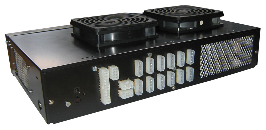 Für die stufige Lasterzeugung dienten fast normale Ohmsche Widerstände, jedoch nicht in der kleinen runden Ausführung, wie man sie aus dem Technikunterricht gewohnt ist. Statt der Standard-Bauteile mit circa fünf bis zehn Millimetern Länge und zwei bis drei Millimetern Durchmesser, kamen größere Varianten mit rund zehn Millimetern Durchmesser, Längen bis zu 60 mm und Belastbarkeiten von bis zu 50 Watt zum Einsatz. Diese kommen auch in eckiger Querschnittsform daher, da sie ein Aluminiumgehäuse zur Kühlung besitzen. Rein passiv sind diese Leistungen bei diesen Größendimensionen allerdings kaum bereitzustellen, weswegen auch eine effektive Kühlung mit in die Planung einfließen musste. Da Stromstärken von teilweise 50 Ampere zudem nicht direkt messbar sind, wurde dies über das Ohmsche Gesetz (U = R x I) realisiert. Dazu nehme man einen weitestgehend konstanten Widerstand und messe statt dem Strom, die darüber abfallende Spannung in Millivolt und schon kann man mit den bekannten und gemessenen Werten die Stromstärke errechnen. Nach stundenlanger Überlegung, Umsetzung und Prüfung wurde so der „Hardware-Mag PSU-Profiler“ geboren, der es nun ermöglicht die wichtigen 3,3 V- und 5 V- sowie 12 V-Leitungen in bedienerfreundlicher Weise zu belasten und je nach Netzteil eben auch die maximal möglichen Stromstärken der einzelnen Leitungen abzufordern. Somit lassen sich auch ohne Probleme die Vorgaben der 80 PLUS-Zertifizierung (Wirkungsgrad größer gleich 0,8 bei 20, 50 und 100 Prozent Output-Power) in den Tests überprüfen.