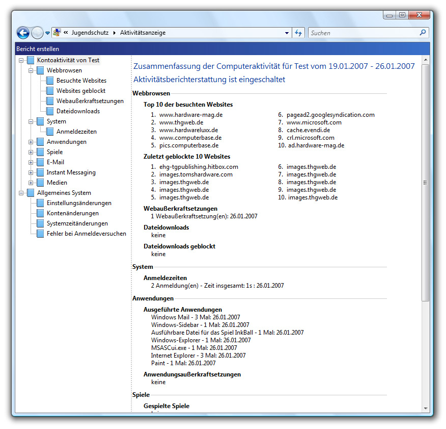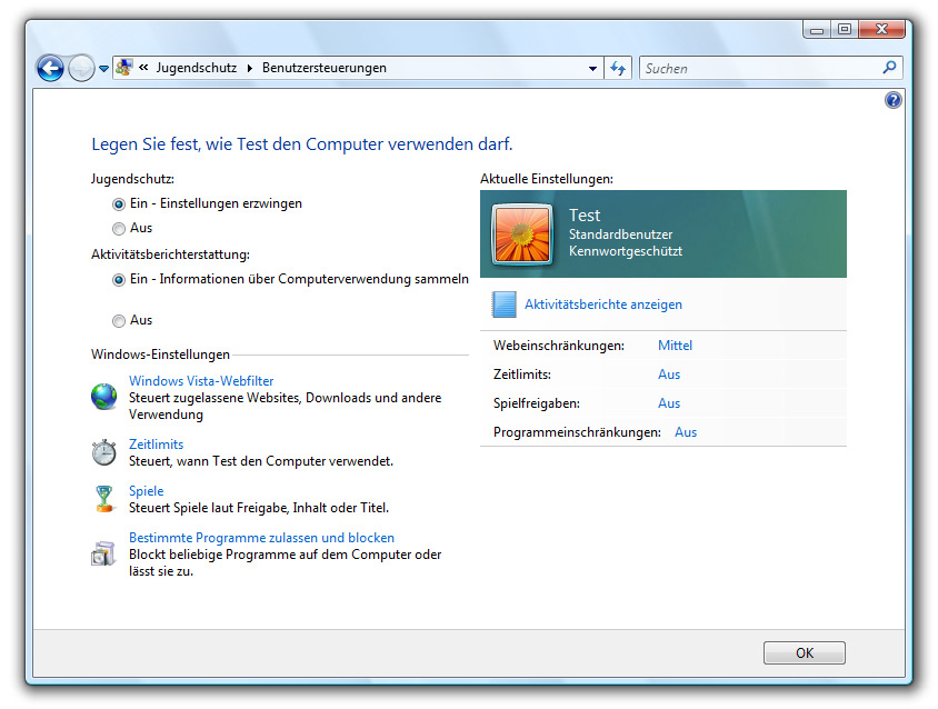 Microsoft hat Vista neben den bereits bekannten Neuerungen wie Internet Explorer 7 und Windows Media Player 11, auch noch weitere Zusätze spendiert. Beginnen wir mit einem zentralen Thema, der Sicherheit. Hier hat Microsoft wiederum eine Firewall, den NX/XD-Bit Support sowie bekannte Windows XP-Features integriert und darüber hinaus Windows Defender standardmäßig in das Security Center mit aufgenommen. Windows Defender kann dazu beitragen den PC vor Spyware zu schützen und reagiert auf aktivitäten unbekannter Software mit einer Warnmeldung, die der Benutzer als Popup zu Gesicht bekommt. Ein weiterer Schutzmechanismus betrifft weniger das Unterbinden von Angriffen auf das System, sondern vielmehr den Schutz von Minderjährigen. Der neuartige Jugendschutz macht es Eltern einfach, die Spiele festzulegen, die ihre Kinder spielen dürfen. Eltern können bestimmte Spiele zulassen oder Spiele einschränken, sodass ihre Kinder nur die Spiele spielen können, die für eine bestimmte Altersgruppe zugelassen sind. Die Eltern können auch Spiele mit bestimmten Inhalten blockieren, von denen sie nicht möchten, dass ihre Kinder diese sehen oder hören. Websites, Downloads etc. können ebenfalls beeinflusst werden. Um den Schutz abzurunden und die Kontrolle zu erhöhen, hat der Computer-Administrator entsprechend Zugriff auf Logfiles von Accounts die dem Jugendschutz unterliegen und kann alle Aktivitäten präzise nachvollziehen und nach Belieben einschränken.