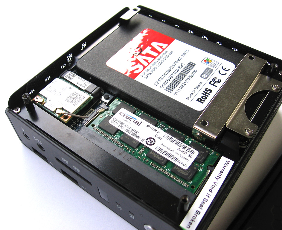 Die Leistungsaufnahme ist mit rund 24 Watt unter Volllast die niedrigste im Testfeld und macht somit auch einen 24/7-Dauerbetrieb vorstellbar. Im lastfreien Idle-Betrieb begnügt sich die CI540 nano sogar mit lediglich 7 Watt! Seitens der Temperaturen liegt die Box aufgrund der passiven Kühlung zwar am Ende der Vergleichstabelle, jedoch noch innerhalb des tolerierbaren Rahmens (83°C unter Volllast). Wie wir im Nachgang zu unseren Tests erfuhren, wurde bei einigen Pressemustern eine größere Schutzfolie nicht entfernt, die eine noch bessere Wärmeleitung zwischen Kühlkörper und Gehäuse während unserer Messungen verhinderte. In der Praxis dürften die Temperaturen also tatsächlich niedriger liegen. Positiv hervorheben möchten wir noch das kompakte Gehäuse mit flexiblen Montagemöglichkeiten (VESA-Halterung) sowie das umfangreiche Schnittstellen-Angebot. Die Plus-Variante wird bereits ab Werk mit 4 GB DDR3-Arbeitsspeicher (nur ein DIMM-Sockel vorhanden) sowie einer 64 GB Phison SSD ausgestattet. Typischerweise liefert ZOTAC die Plus-Modelle mit einer mobilen HDD aus, macht hier jedoch eine Ausnahme und hält konsequent am Geräuschlos-Konzept fest!